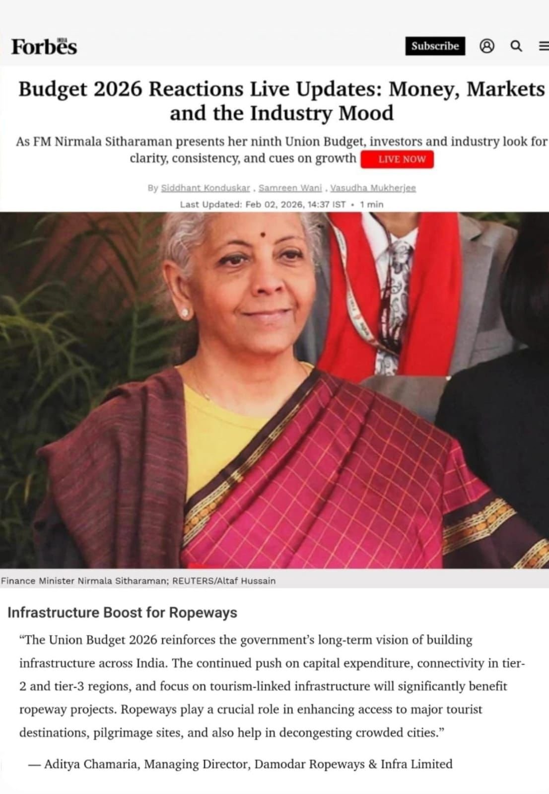 In a recent interaction with Forbes, The Hindu Business Line, Mr. Aditya Chamaria, Managing Director, Damodar Ropeways & Infra Limited, shared his insights on how the Union Budget 2026 reinforces the government’s focus on capital expenditure, regional connectivity, and tourism-driven infrastructure growth.